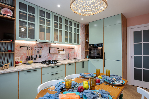 Фрески на материале Саббия с цветочным сюжетом из каталога Atmosphere, (арт. AF524-COL3) украсили зону фартука на кухне. Этот материал создан специально для оформления мокрых зон и имеет двустороннюю гидроизоляцию. Исключением являются лишь зоны с постоянным прямым попаданием воды – душевые кабины и чаши бассейнов. Пред монтажом фрески на стену рекомендуется нанести противогрибковый грунт, а все прорези для сантехнического оборудования обработать силиконовым герметикам, чтобы за полотно не попадала вода. Полотно немного заходит за нижние и верхние шкафы для большей герметичности. Клей для помещений с повышенной влажностью необходимо использовать усиленный, который поставляется в комплекте с фреской по запросу. Для ухода необходимо использовать щадящие моющие средства, поэтому зону плиты рекомендовано закрывать стеклом.